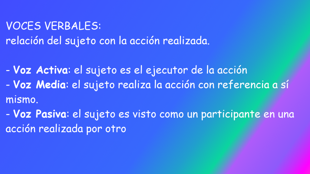 Las terminaciones de persona son distintas según el tipo de verbo. Tenemos tres grupos de verbos, según la acción del verbo recaiga en quien realiza la acción o no.
