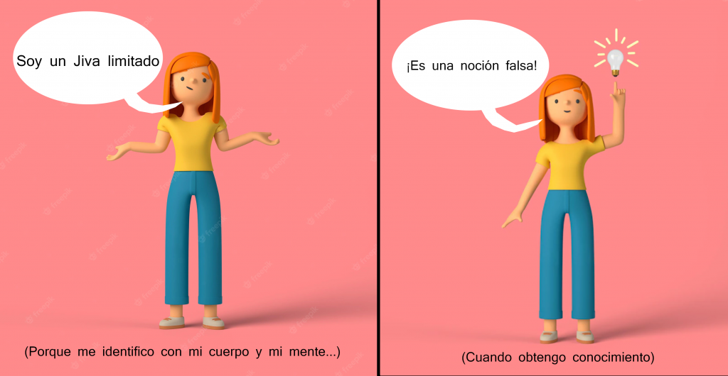 Seguimos con el Jiva, y vemos que debido a una percepción errónea de cómo funcionan las cosas, nos parece que el Jiva es el Yo real, pero esto sucede porque no entendemos que todo su poder y vitalidad procede del Ser Superior, del Atman. Vemos el Jiva como un personaje con características, personalidad, atractivo, se puede tocar, se mueve, habla, parece que piensa, etc…y pensamos que ese es el Yo real. Sin embargo, todas esas características pertenecen al Ego, que las toma del Ser o Atman. Y, por extensión, creemos que todas las limitaciones del Jiva son también limitaciones del Ser. Pero el Ser es ilimitado y no lo sabemos porque lo vemos tan limitado como el Jiva.